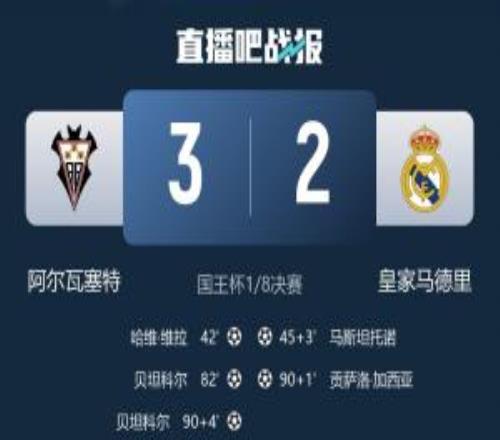 体育播报01月15日宣 国王杯1/8决赛,阿尔瓦塞特爆冷3-2绝杀皇马。阿尔瓦塞特目前西乙6胜6平9负,排在第17名,仅高...