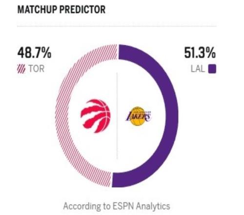 北京时间1月19日,NBA常规赛继续进行,湖人坐镇主场迎战猛龙。猛龙上一场加时鏖战惜败快船,目前以25胜18负稳居东部第四,本赛季整体表现亮眼。球队依托强悍锋线群主打防守反击战术,防守效率跻身联盟前五,场均仅失112.3分,同时快攻得分以19.3分领跑全联盟,攻防转换极具冲击力。英格拉姆、巴雷特与巴恩斯组成的锋线三叉戟火力凶猛,三人场均合砍超60分,是球队得分核心。反观湖人,昨天不敌开拓者后遭遇两连败,近6场比赛输掉5场,状态陷入低迷,目前以24胜16负排在西部第六,赛季表现中规中矩。球队此前三核齐发时攻势顺风顺水,但里夫斯伤缺后攻防节奏受扰,如今东契奇又添伤病麻烦,再加上外线射手群稳定性不足,整体战力折损严重,伤病名单也持续拉长!不过,好在今天的比赛,东契奇、艾顿回归,詹姆斯不再孤军奋战。两队在12月5日交手过一次,那场比赛八寸垒3分绝杀猛龙!赛前,ESPN结合两队现状给出预测,湖人此役取胜概率为51.3%,猛龙取胜概率为48.7%。